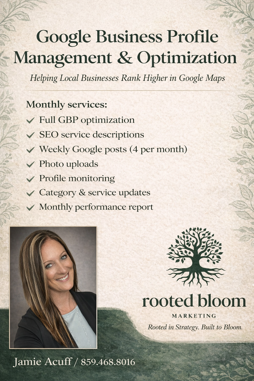 Rooted Bloom Marketing helps local businesses improve their visibility in Google Maps through professional Google Business Profile optimization and management. Many businesses claim their listing but never fully optimize it, which means missed opportunities to appear in local search results. I work with businesses throughout Northern Kentucky and the Cincinnati area to strengthen their online presence by optimizing business descriptions, services, categories, and profile activity. Services include Google Business Profile optimization, ongoing management, weekly posts, photo updates, and AI & voice search readiness. My goal is simple: help your business appear where customers are already searching - on Google.